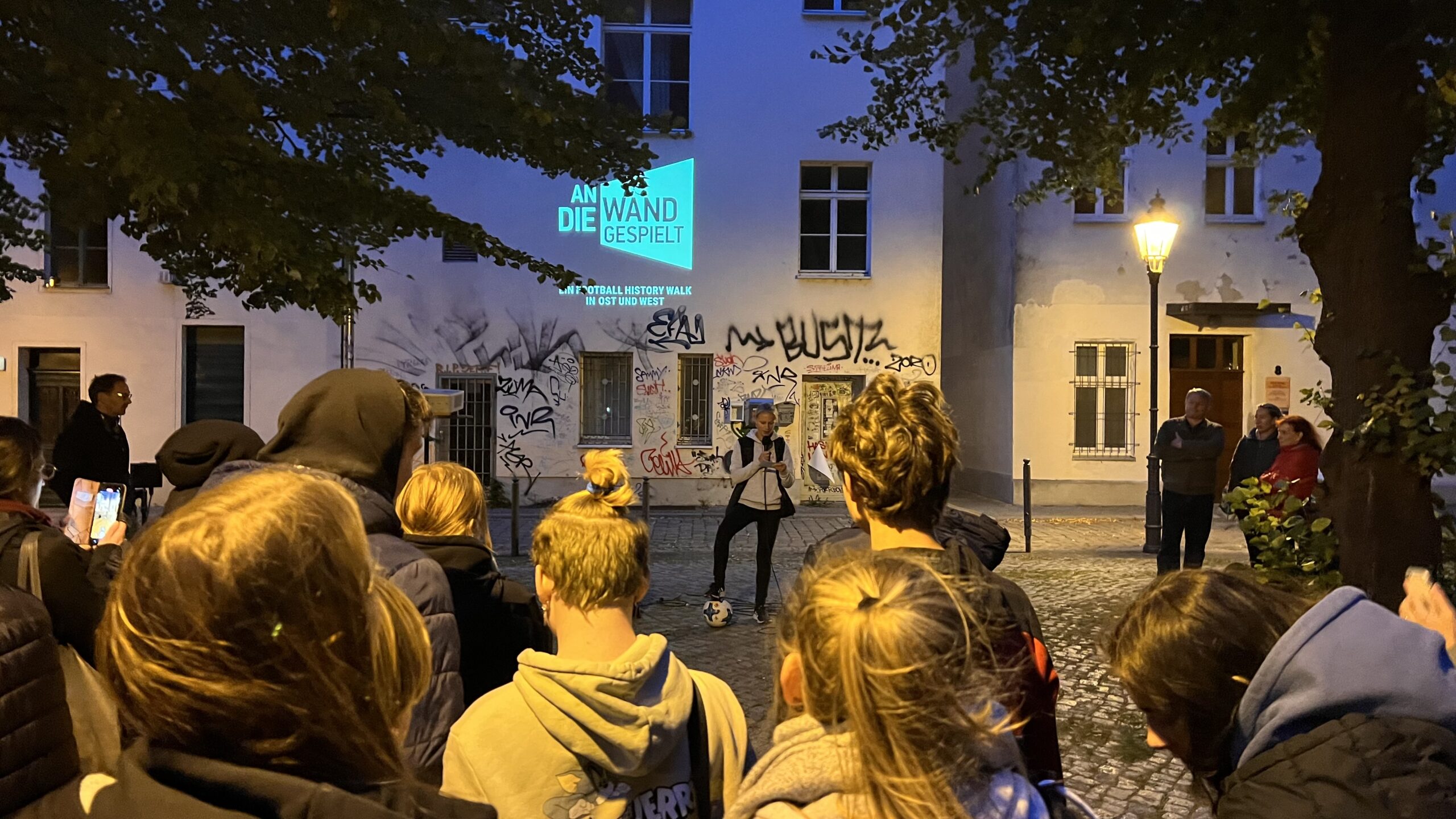 In der Vorbereitung des Football History Walks trafen die Schüler*innen der Klasse 10A der Otto-Tschirch-Oberschule auf den AN DIE WAND GESPIELT-Zeitzeugen Roy Präger zum Interview und produzierten diesen Clip, der an der Hauptstraße Ecke Packhofstraße auf einer Häuserwand zu sehen war.
