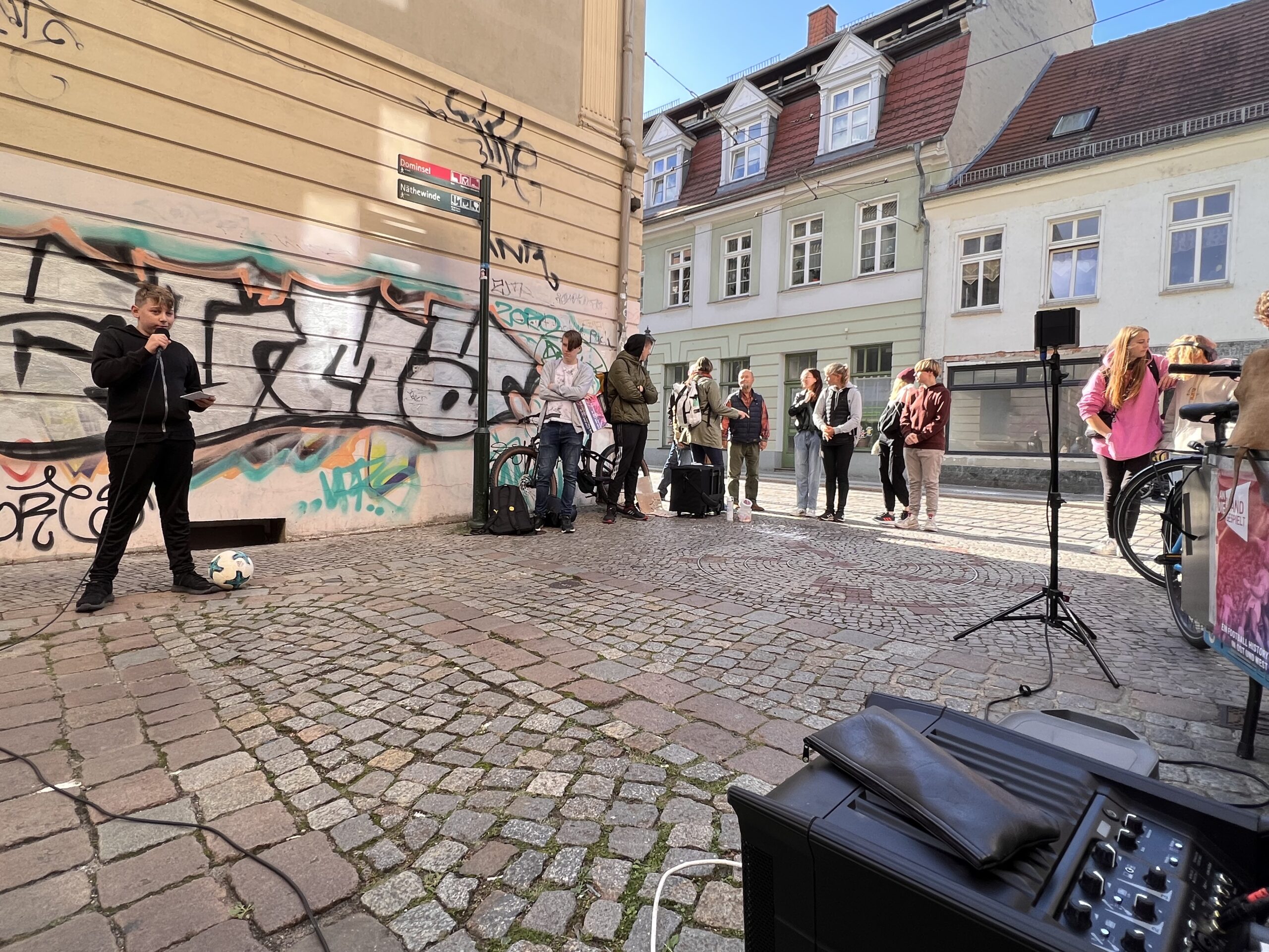 Beim Stadtspaziergang, den Schüler*innen der Otto-Tschirch-Oberschule erst in einer Workshopwoche vorbereitetet und dann am Abend des 16. September auch durchgeführt haben, tauchten die Besucher*innen ein in die (Fußball-)Geschichte der Stadt.